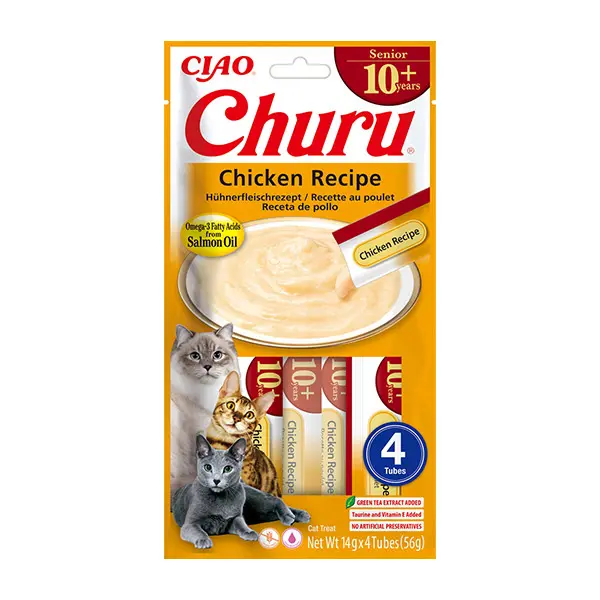 Churu kreminis skanėstas su vištiena senyvoms katėms, papildytas vitaminais C, E ir antioksidantais, kurie palaiko stiprų imunitetą.