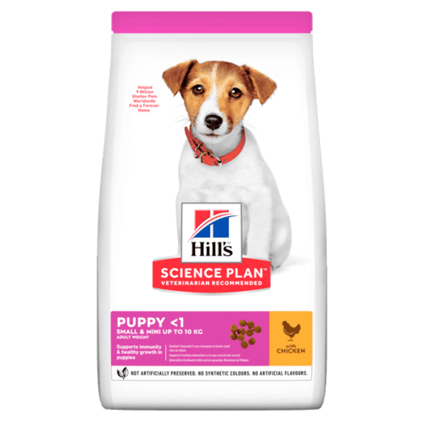 Hill’s visavertis maistas mažų ir miniatiūrinių veislių šuniukams nuo 4 savaičių iki 1 metų amžiaus. Taip pat tinka vaikingiems šunims. Nėra pridėta jokių dirbtinių konservantų, kvapiųjų medžiagų ar dažiklių. Palaiko smegenų, raumenų ir kaulų imunitetą ir sveiką vystymąsi. Didelis kliniškai patikrintų antioksidantų ir DHA kiekis iš žuvų taukų.