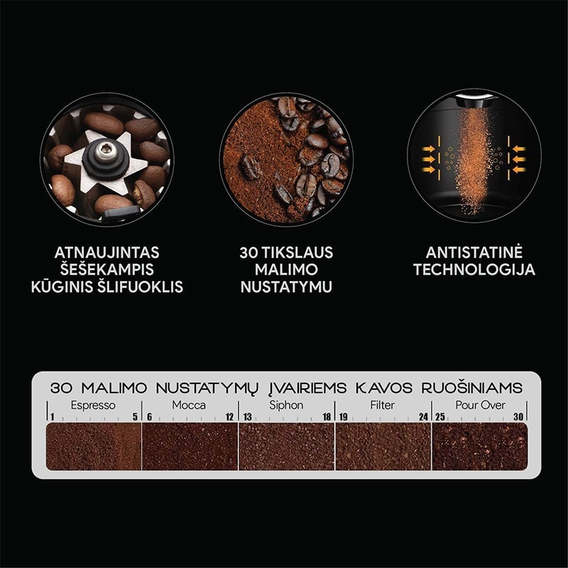 Inovatyvus šešiakampis dizainas užtikrina vienodą pupelių malimą, leidžiant išryškinti nepriekaištingą skonį ir aromatą.