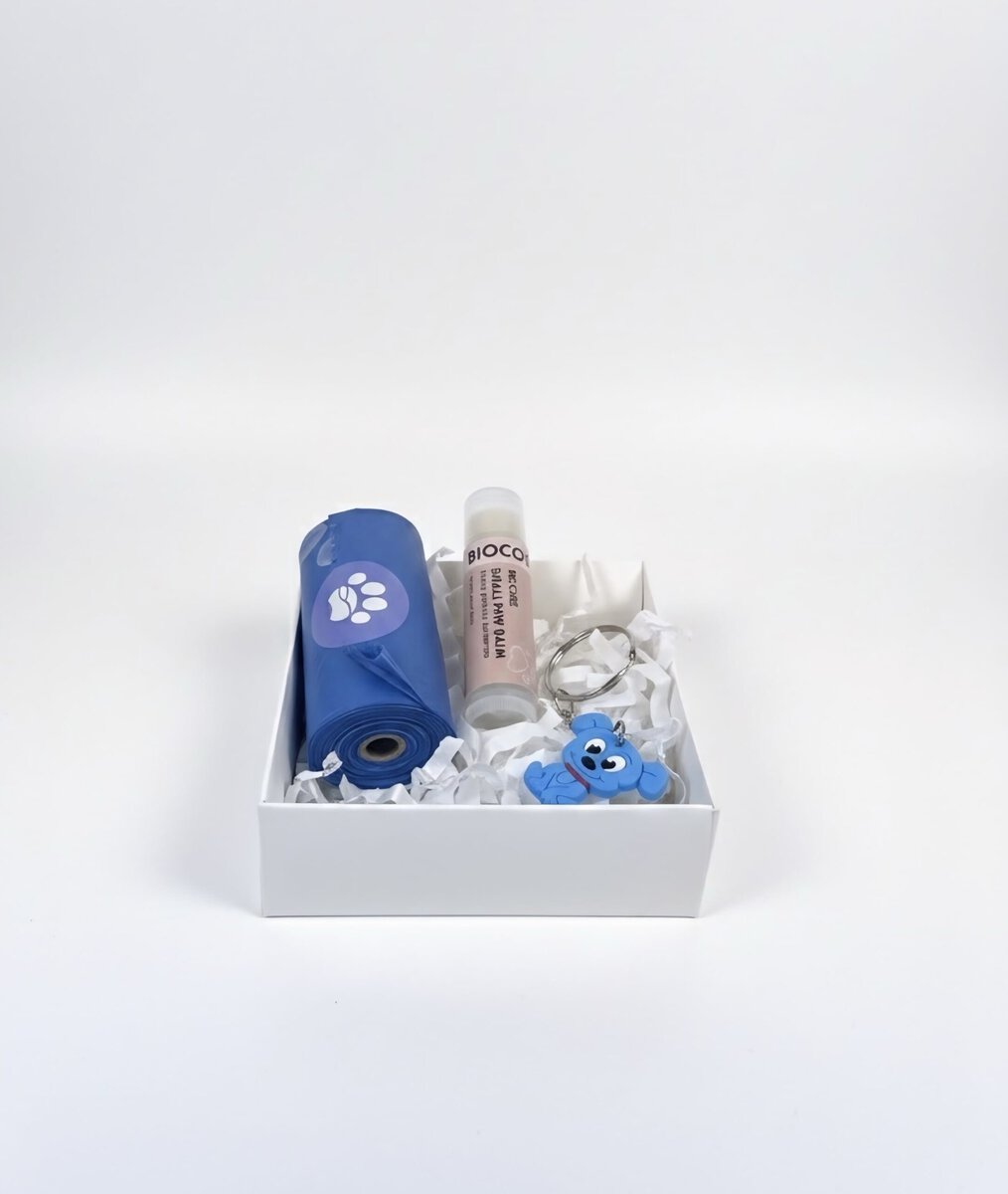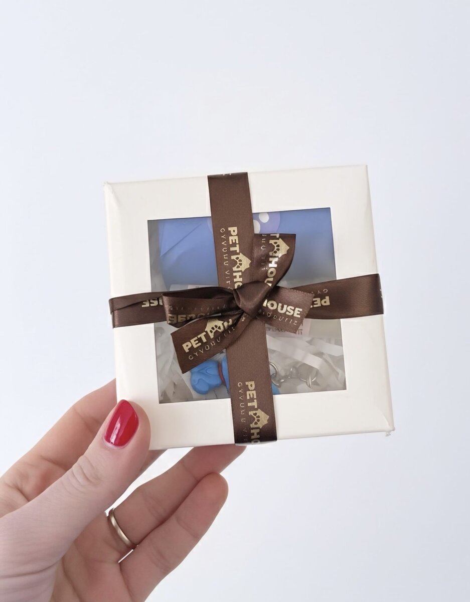 Jauki balta mini dovanų dėžutė, perrišta rudu kaspinėliu, sukurta kaip subtili ir praktiška staigmena jūsų mylimam šuniukui. Tai puikus mažas rinkinukas kasdieniams poreikiams.