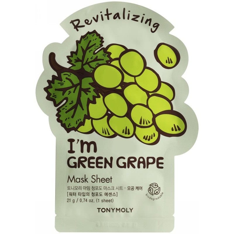 TONYMOLY „I´m Green Grape Mask Sheet“ veido kaukėje esantis vynuogių ekstraktas pasižymi antioksidantų gausa, padeda šviesinti ir atgaivinti odą, suteikia jaunatvišką spindesį.